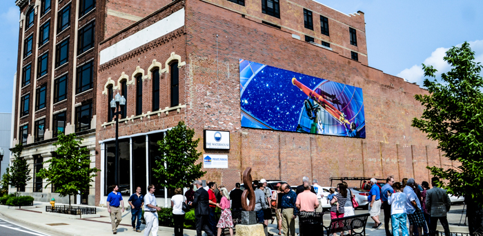 The work, printed by Adams Outdoor, is entitled “Look to the Stars” (2015), a light painting created by Doug and Eileen Leunig. “Look to the Stars” is symbolic of the quest to know the unknowable. People have looked beyond themselves for centuries to find the answers to the questions about their lives and our universe. “Look to the Stars” represents the desire to explore, to discover, and to achieve the unreachable. The telescope is a symbol of the groundbreakers in society, the leaders who take us to new breakthroughs and innovative ways of thinking. The image was chosen specifically for the MAXAM building because it best represented the groundbreakers in the Warehouse District charting a new course for others.